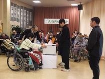12月20日 忘年会でホールでの食事会。いつもと違う雰囲気の中、だるまの目入れを行いおなかいっぱい食事を楽しまれました。