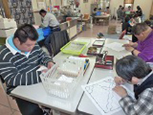 クラフト班はメンバー20人で構成され、室内作業を中心とした日中活動を行っています。作品は製品として取次店へ毎月納品し、陶芸小物や手芸品・牛乳パック再生紙を主に製作を続けています。個人にあった作業をすすめ、個性ある作品作りを目指しています。また、レクリエーション活動や外出などの企画を組み、みんなが楽しめる活動を行っています。